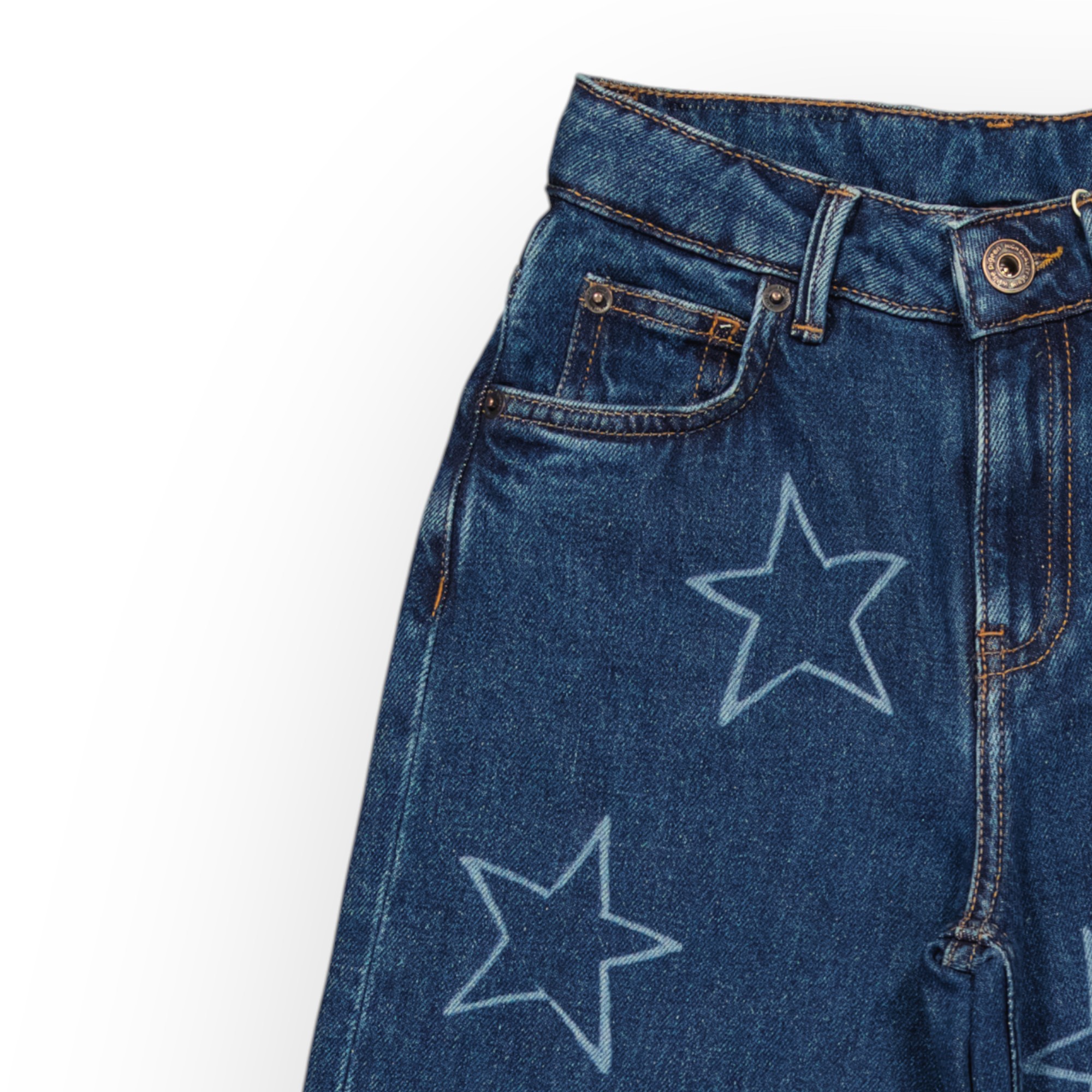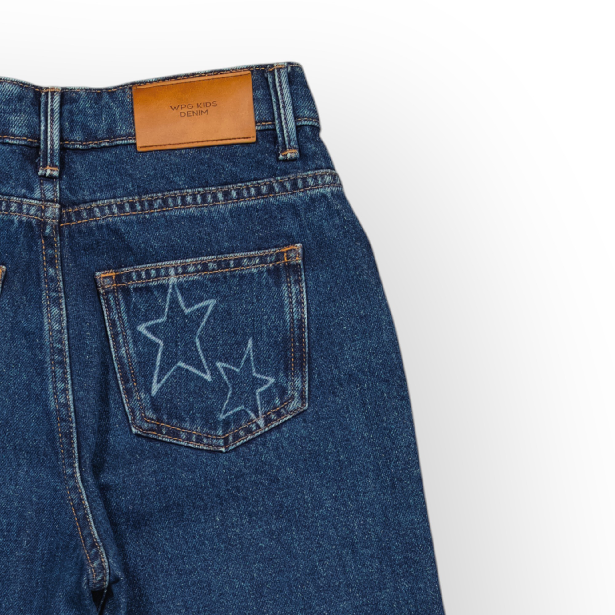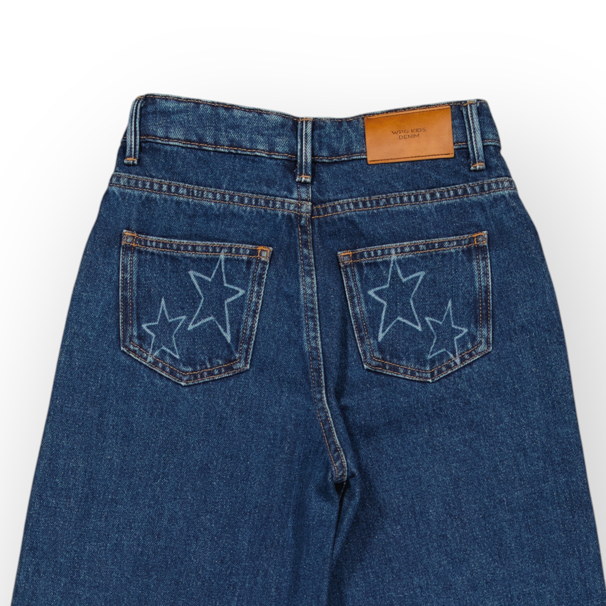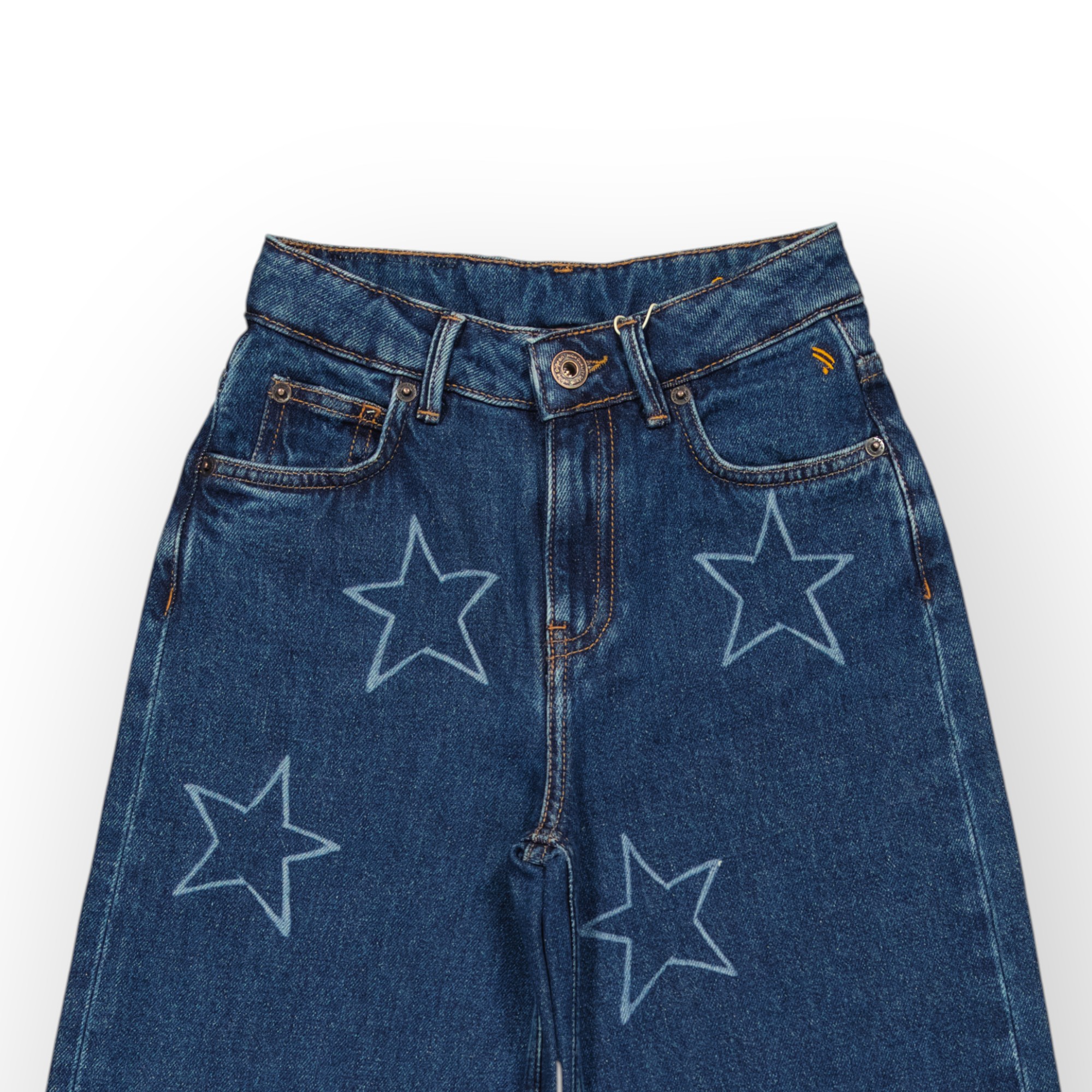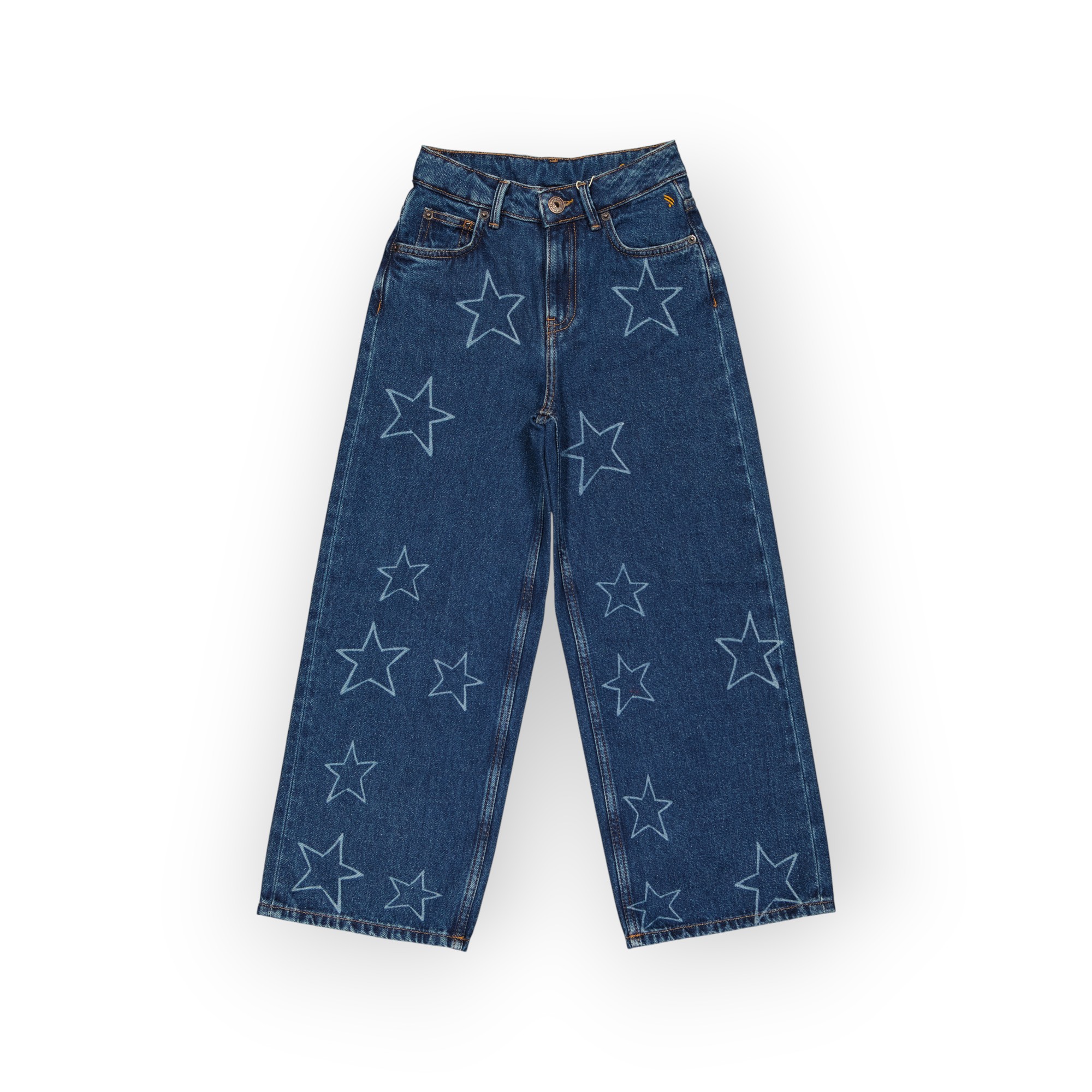 Jean 5 poches bleu foncé pour fille en denim coton doux et rigide , à détails d’étoiles appliqués devant et sur les poches de dos de différentes tailles apportent une touche ludique et originale , sa coupe ample offre une grande liberté de mouvement