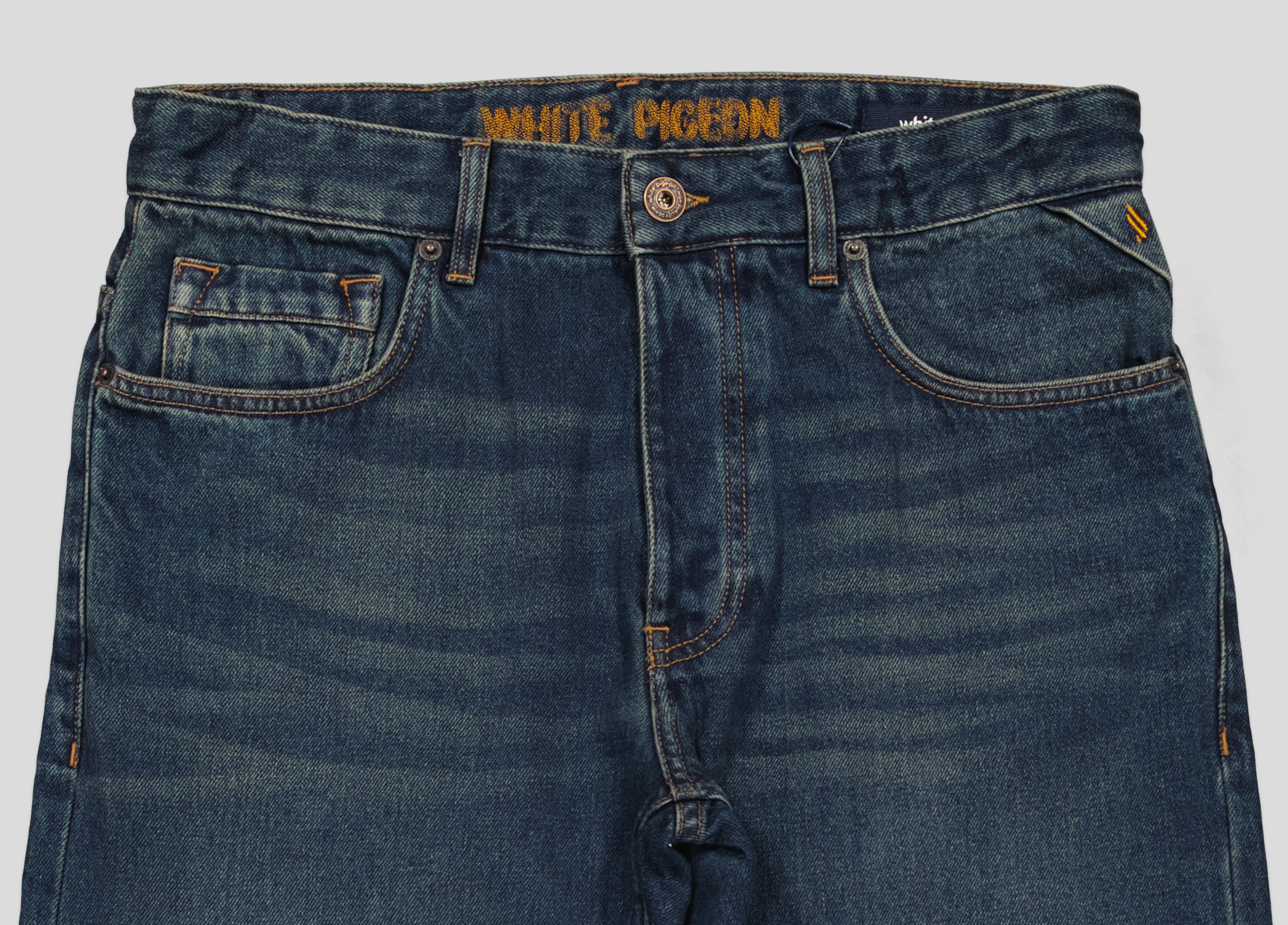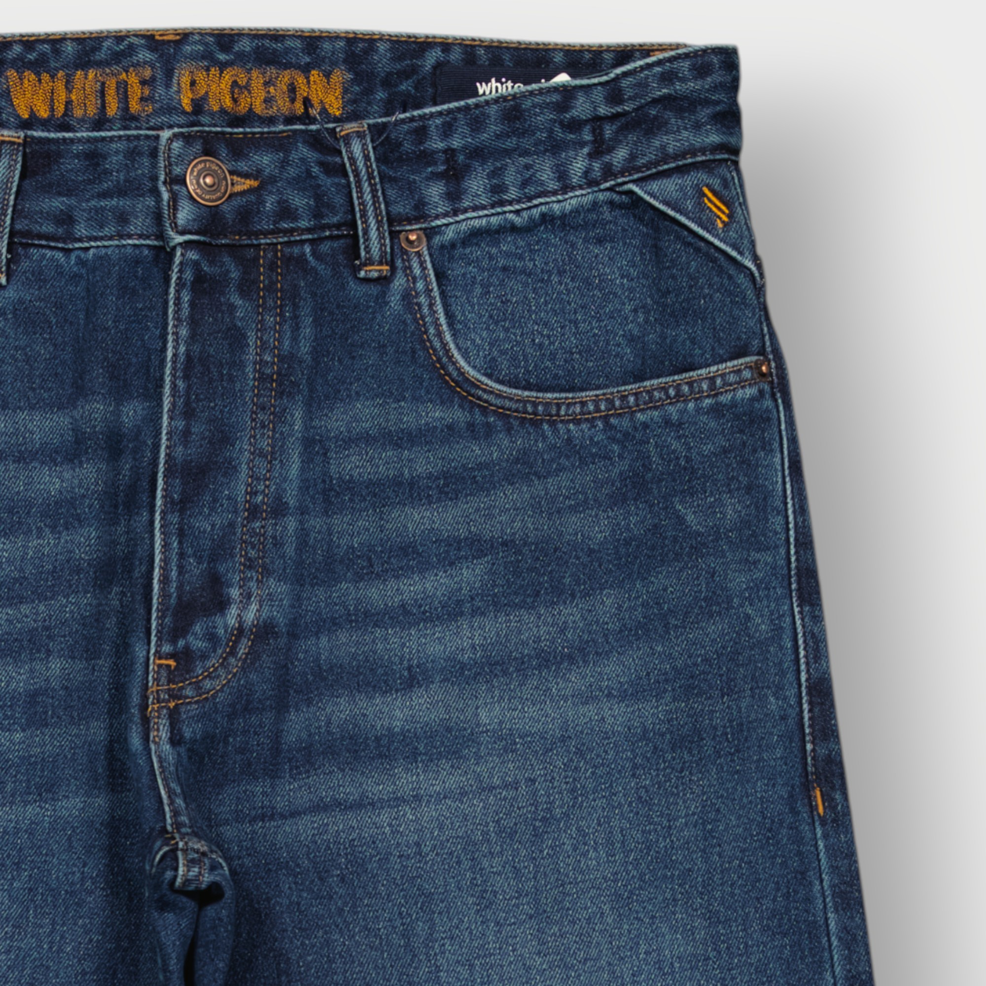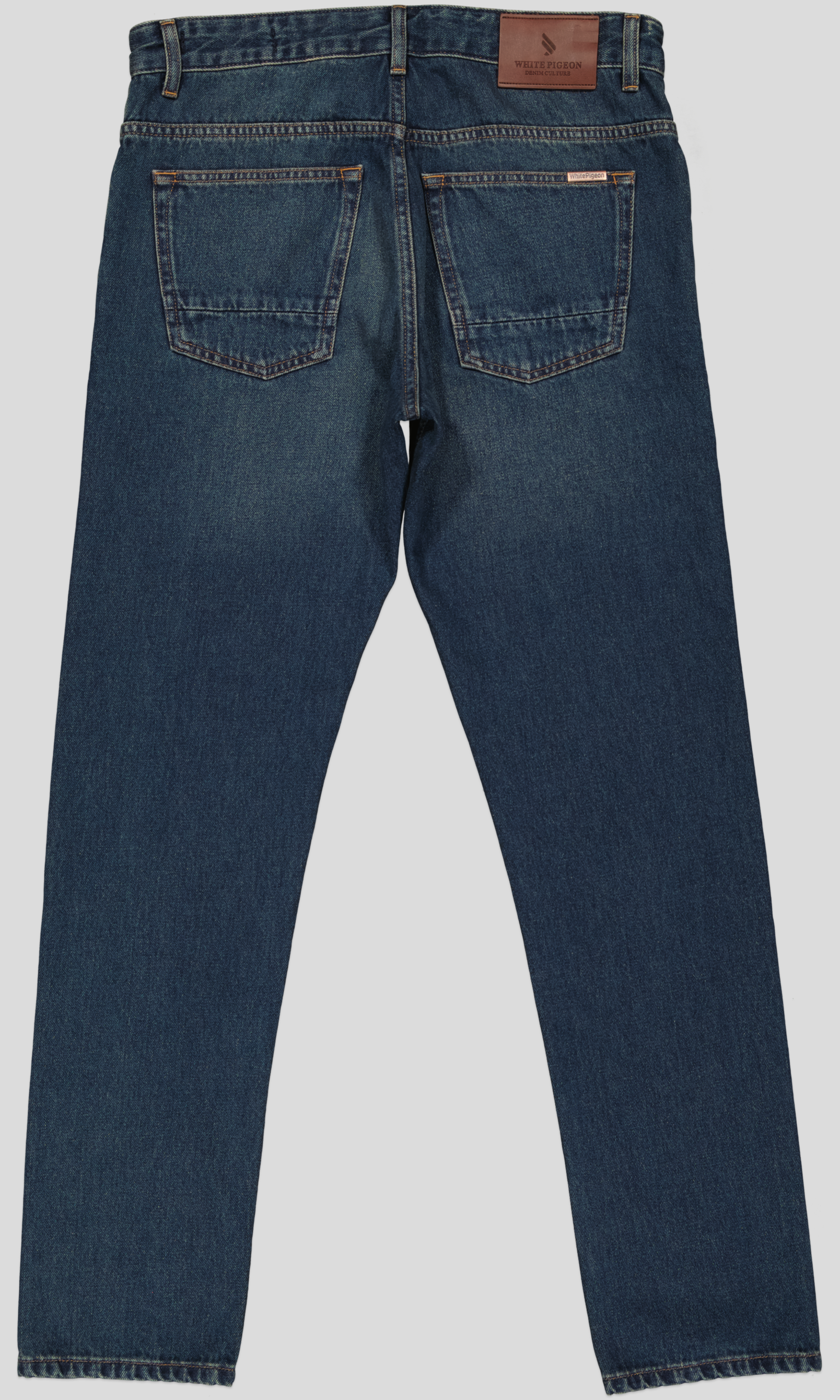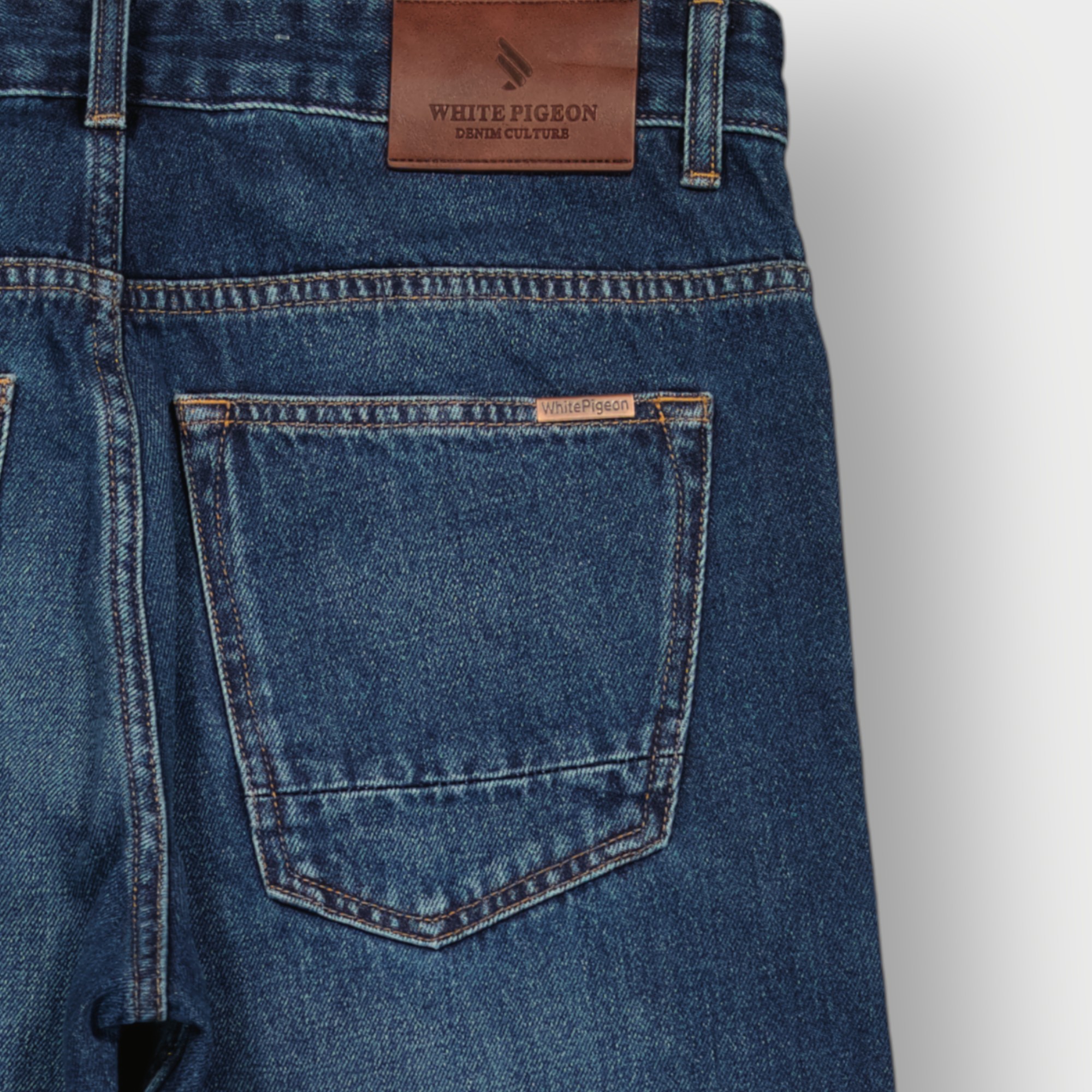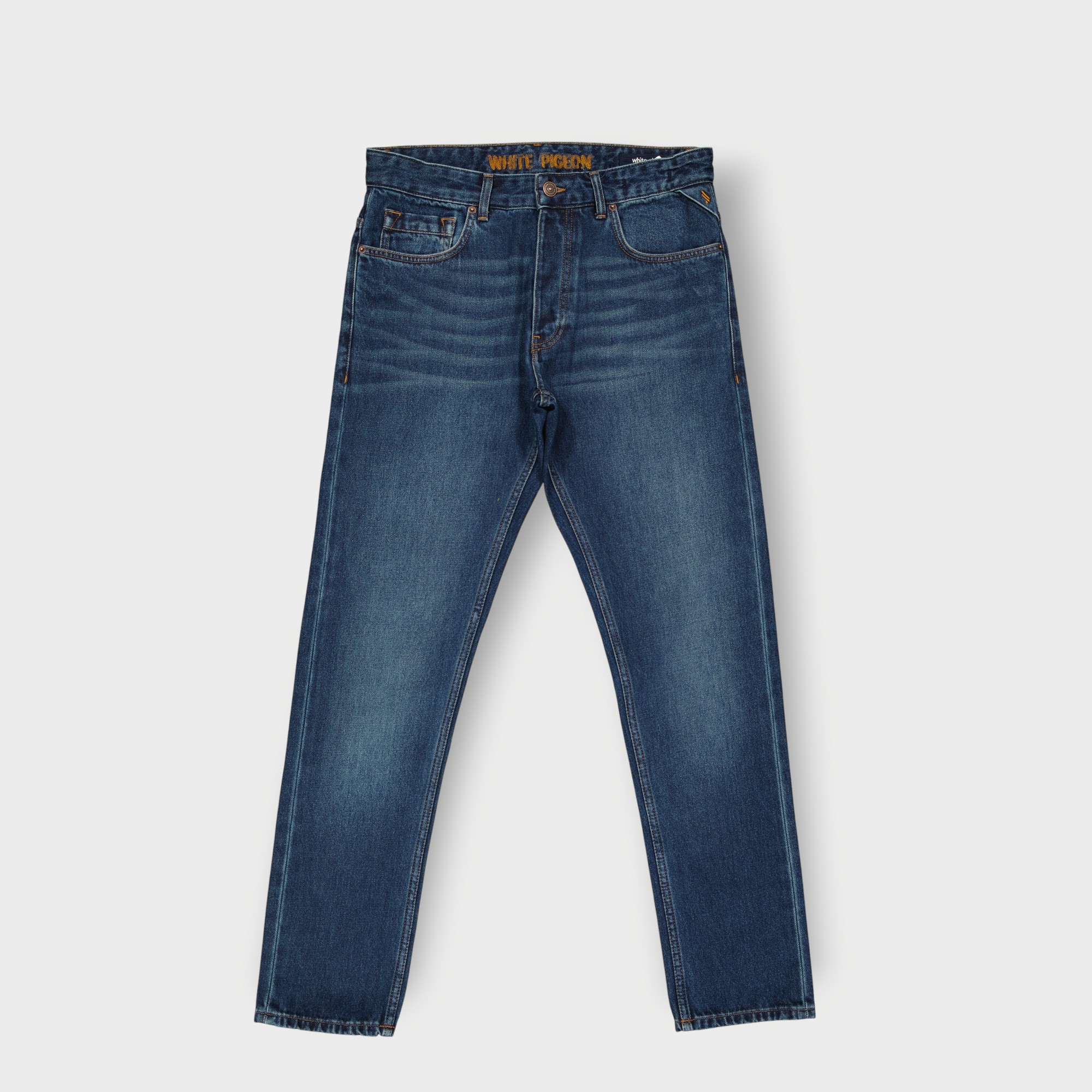 Jeans Cinq Poches Regular en denim bleu présente une coupe classique à cinq poches avec une fermeture boutonnée et des passants de ceinture, surpiqûres contrastées et rivets métalliques aux points de tension, avec nom de la marque brodé sur la ceinture intérieure et un délavage moyen à foncé avec des effets subtils sur les cuisse un style authentique relaxée combinée avec une matière cotonnée 100% offre une résistance pour un usage quotidien.